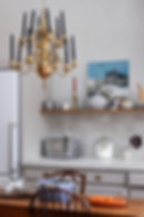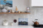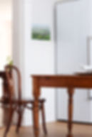 The lamp on the counter was my dad's Christmas present to my mom, found on eBay, which she clearly picked out. The chandelier was also an eBay find. The hutch is an oldie found on Craigslist painted a color that never fails, Hague Blue. The ever-talented Grace B. Keogh painted all of the art in the kitchen. Some are available for sale.