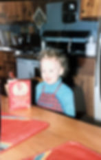 It seems I love to draw out kitchen reveal posts. But the wait is over; it's time to dive into my parent's kitchen renovation! So let's start from the beginning, the very beginning. Here I am in 1986 crushing raisins in our old kitchen. It had pine cabinets, red laminate countertops, white appliances, and a layout that didn't work. In '86, there was no "foyer."